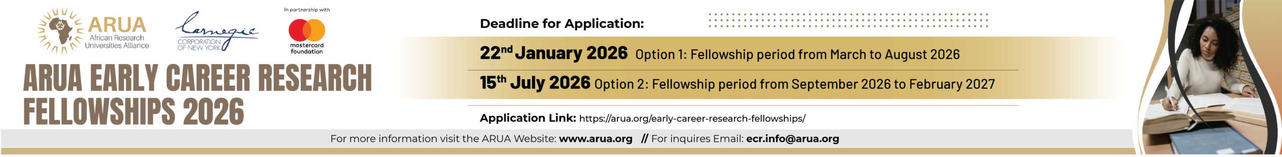To support the activities of the centres as well as the clusters, ARUA is announcing a residential Early Career Research Fellowship that is expected to last for 6 months. During this period, prospective research fellows are expected to stay at the host or affiliated ARUA university of the respective CoE or CoREs and conduct research related to their existing projects. Successful candidates are also expected to explore new lines of research with the approval of the Centre’s Director or CoRE co-leads. Prospective candidates are encouraged to visit the ARUA website as well as those of the CoEs and CoREs to familiarize themselves with their ongoing research projects.